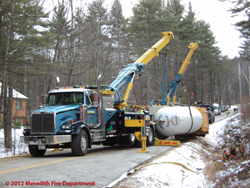 Meredith companies were notified at 10:08 of a motor vehicle rollover in front of 141 Camp Waldron Road. Companies arrived on scene to find a 4,000 gallon LP truck on its side. It was quickly determined the tank was not leaking. Crews deployed hand lines and stood by while a lengthy recovery operation began.